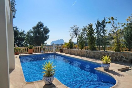 Spektakuläre Ferienvilla mit hohem Standard für 4 Personen und mit privatem Pool an der Küste Benissas. Die Villa befindet sich in der Wohngegend Montemar, ruhige Wohnlage und nur wenige Autominuten vom Strand entfernt. Die Villa hat eine Wohnfläche von etwa 100 m² und ein geschlossenes Grundstück von etwa 1.000 m². Innenausstattung: das Haus hat eine Etage mit geräumigem Wohn-Esszimmer, ausgestattet mit Qualitätsmöbeln, einen groβen Fernseher (nur englische Programme) DVD-player und eine Stereoanlage, Klimaanlage und Deckenventilator und Zugang zur überdachten Terrasse und zum Schwimmbad. Offene, komplett ausgestattete Küche, mit Glaskeramikkochfeld, Geschirrspüler, Mikrowelle, Backofen, Kühl- und Gefrierschrank, Toaster und weiteren Küchenutensilien. 1 Schlafzimmer mit Doppelbett und Badezimmer en suite mit Dusche, WC und Waschbecken. 1 Schlafzimmer mit Doppelbett, Deckenventilator und Badezimmer en suite mit Dusche, WC und Waschbecken. ÜberdachteTerrasse mit Sofas und Zugang zum Schwimmbad. 1 Hauswirtschaftsraum mit Waschmaschine. Obere Etage: geschlossen und nicht bewohnbar. Auβenanlagen: Schwimmbad von 8x4m mit römischer Treppe, teilweise Meerblick und Blick auf den Peñón de Ifach. Auβendusche, Gasgrill, bequeme Liegen. Entfernungen: Steinbucht Baladrar: 3 km, Supermarkt (Pepe la sal): 3 km, Sandstrand in Moraira (la ampolla) 6 km, Sandstrand Benissa (la fustera) 6 km, Stadtzentrum Moraira: 6,5 km.