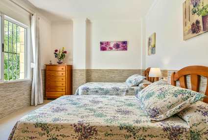 Grosses Zimmer mit Doppelbett und 2 Einzelbett. Badezimmer en suite.