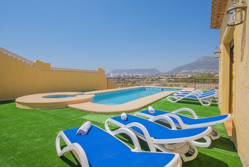 Aussenbereich: Hier kann man auf der Terrasse den viereckigen Pool 9x4,5m mit römischer Treppe geniessen, sowie einem kleinen Pool für Kinder.1 Raum mit WC und Waschbecken und Aussendusche. Hier kann man am Aussengrill Essen im Freien zubereiten und geniessen. Grosse überdachte Terrasse mit Blick auf die Berge und die Stadt Calpe.