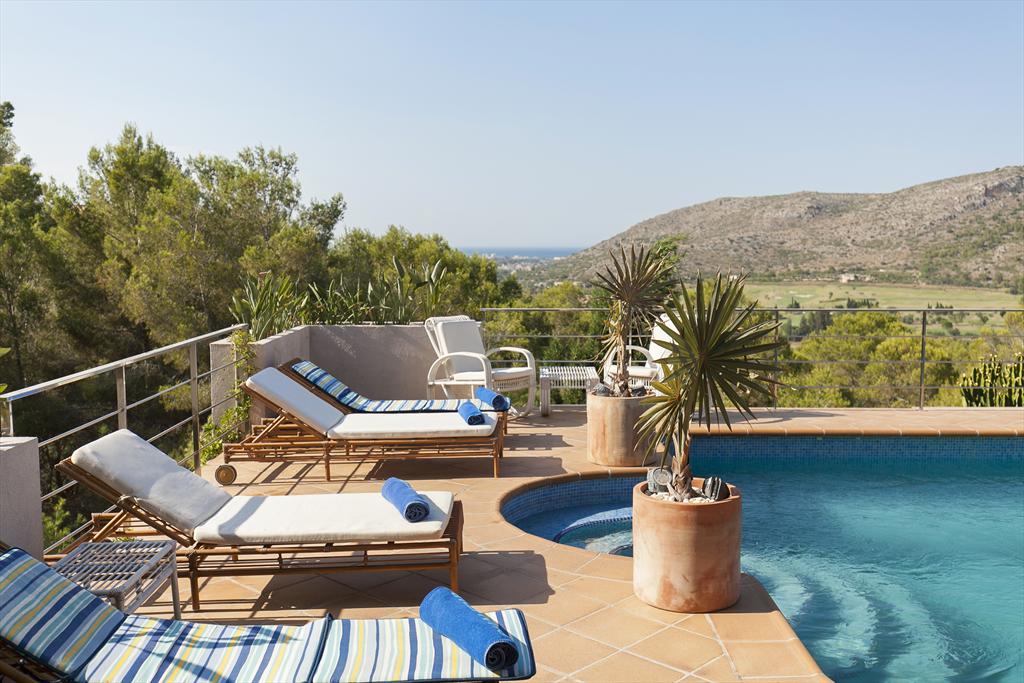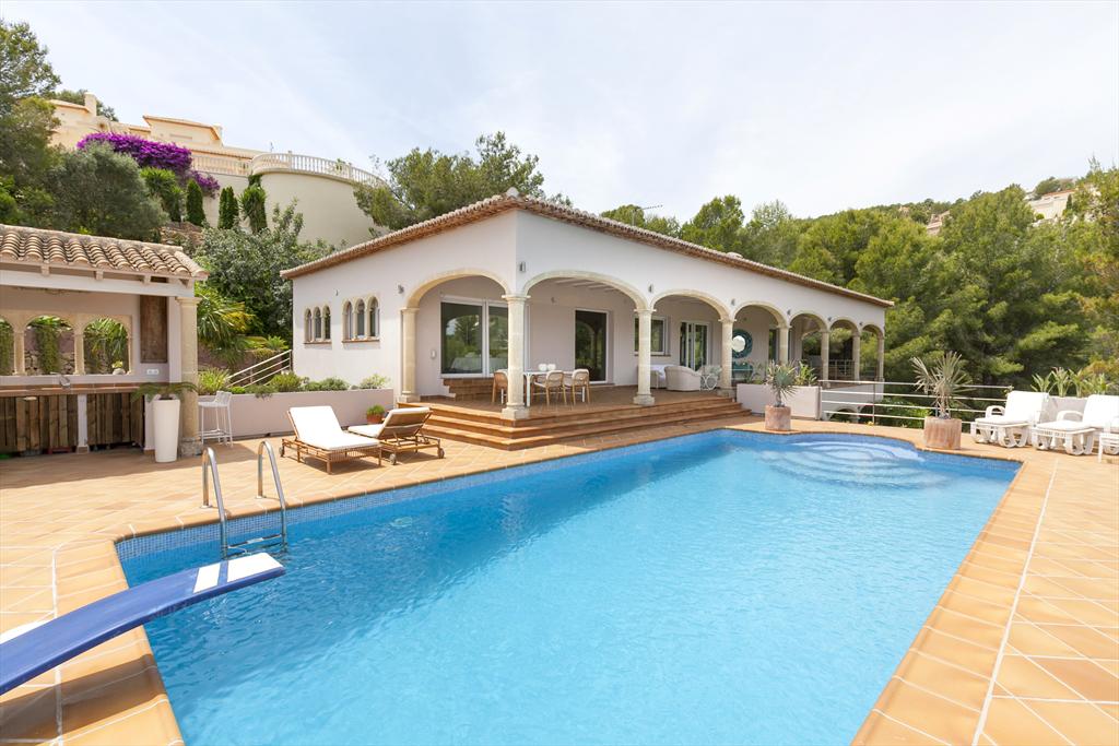 Klassische und Luxus Villa in Denia, an der Costa Blanca, Spanien mit privatem Pool für 8 Personen. Die Villa liegt in einer hügeligen und städtischen Küsten-Umgebung und in der Nähe von einer Golfbahn.