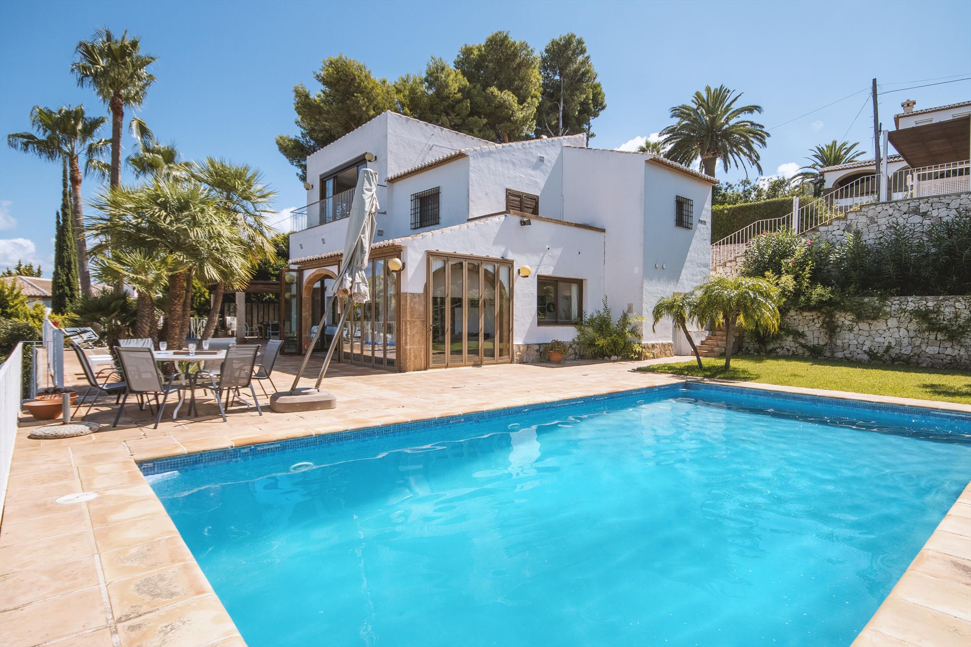 Wunderschöne und komfortable Villa mit privatem Pool in Javea, an der Costa Blanca, Spanien für 8 Personen. Das Haus liegt in einer residentiellen Umgebung und etwa 3 Km entfernt vom Strand von Cala de la Barraca, Javea.