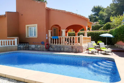 Feriensiedlung "Monte Verde". Im Ortsteil Tosalet, 3 km vom Zentrum von Jávea, 3 km vom Zentrum von Jávea-Arenal, am Hang, 2.5 km vom Meer. Zur Alleinbenutzung: Grundstück, Schwimmbad (7 x 3 m, 120 - 220 cm tief, saisonale Verfügbarkeit: 01.Jan. - 31.Dez.). Gartenmöbel, Parkplatz beim Haus. Einkaufsgeschäft 1 km, Restaurant 1 km, Sandstrand 2.5 km.Verfügbarkeit