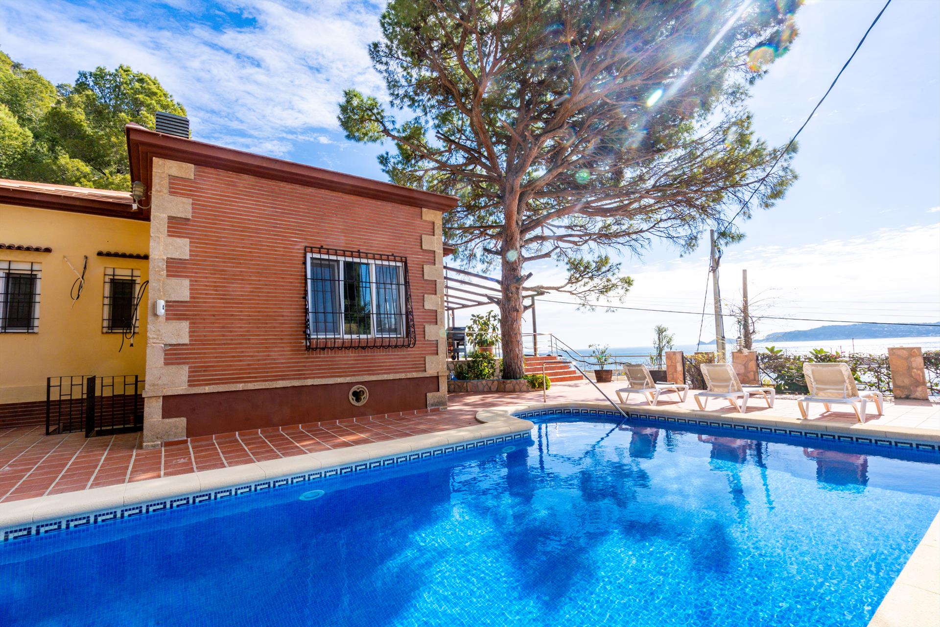 Die Villa hat 4 Schlafzimmer und 3 Badezimmer, verteilt über die Hauptunterkunft und eine separate Wohneinheit. Die Unterkunft bietet Privatsphäre, einen Garten mit Bäumen, einen schönen Pool, einen wunderschönen Blick auf den Hafen und einen schönen Blick auf die Meeresbucht, das Meer und die Stadt. Die Nähe vom Strand, Einkaufsmöglichkeiten, Sportaktivitäten, Freizeiteinrichtungen, Orten zum Ausgehen, Sehenswürdigkeiten und Kultur macht dies zu einer geeigneten Villa um Ihre Ferien in Spanien zu verbringen mit Familie und Freunden.