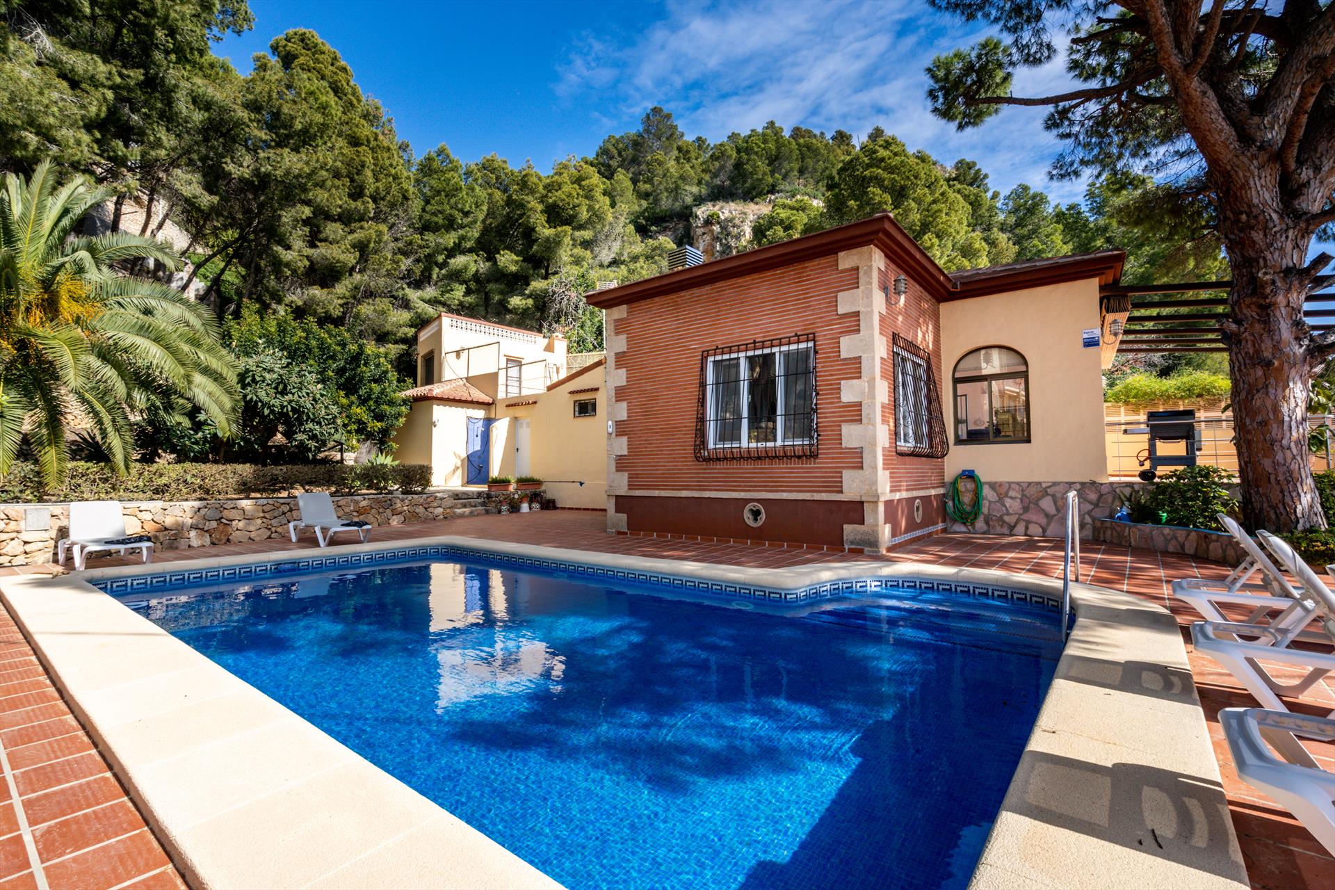 Schöne und romantische Villa in Javea, Costa Blanca, Spanien mit privatem Pool für 8 Personen. Das Haus liegt in einer hügeligen, waldreichen und residentiellen Umgebung, in der Nähe von Restaurants und Bars und Geschäften, etwa 500 M entfernt vom Strand von Playa del Montañar und etwa 0,5 Km entfernt von Mediterraneo.