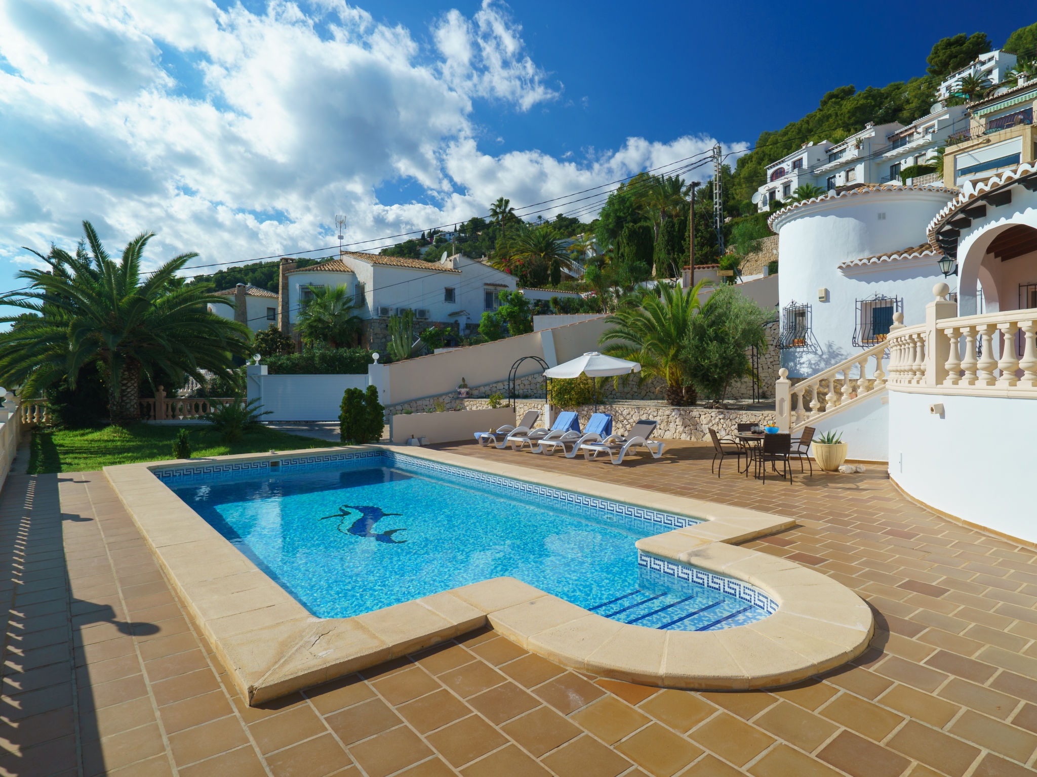 Sehr schöne Villa "Iris". 3.5 km vom Zentrum von Moraira, ruhige, sonnige, erhöhte Lage, 3.1 km vom Meer, 4 km vom Strand, an einer Strasse. Zur Alleinbenutzung: Grundstück (eingezäunt), Schwimmbad eckig (5 x 10 m, saisonale Verfügbarkeit: 01.Jan. und 31.Dez.) mit Innentreppe. Dusche/WC im Poolbereich, Gartenmöbel, Grill. Im Hause: Wireless LAN, Klimaanlage, Waschmaschine, Wäschetrockner. Parkplatz (für 2 Autos). Einkaufsgeschäft 3.3 km, Lebensmittelgeschäft 2.6 km, Supermarkt 2.6 km, Einkaufszentrum 3.3 km. Golfplatz (9 Loch) 2 km. Bitte beachten: Fahrzeug empfohlen. Geeignet für Familien. Jugendgruppen nur auf Anfrage.Verfügbarkeit