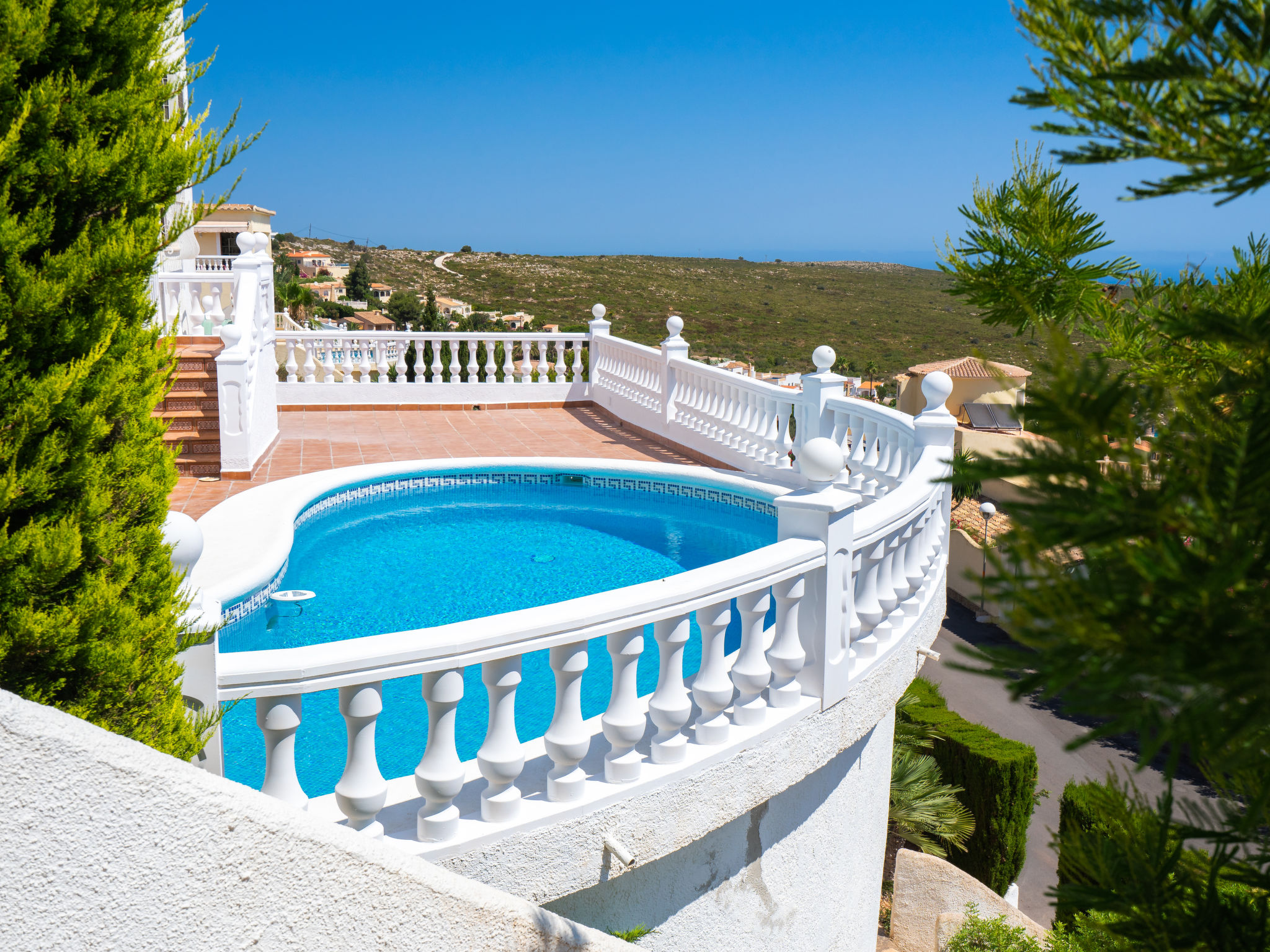 Cumbre del Sol: Schöne Villa "Dalias", auf 2 Stockwerken. Im Ort, 8 km vom Zentrum von Moraira, ruhige, sonnige, erhöhte Lage im Villenviertel, verkehrsberuhigte Zone, 3 km vom Meer, 3 km vom Strand. Zur Alleinbenutzung: Grundstück (eingezäunt), terrassierter Garten, Schwimmbad (8 x 4 m, 120 - 200 cm tief, saisonale Verfügbarkeit: 01.Jan. - 31.Dez.). Aussendusche, Terrasse, Grill. Supermarkt 1 km, Restaurant 1 km, Steinstrand "Cala del Moraig" 3 km. Sporthafen 9 km, Jacht-Hafen 9 km, Golfplatz 11 km. Nahe gelegene Sehenswürdigkeiten: Aqualandia, Mundomar, Terra Mítica, Terra Natura, Benidorm Palace (Benidorm), Les Fonts de l'Algar. Bitte beachten: Fahrzeug empfohlen.Verfügbarkeit