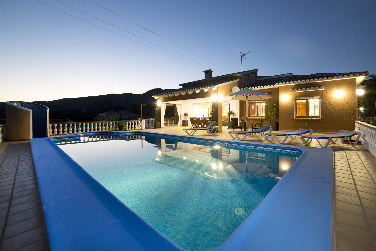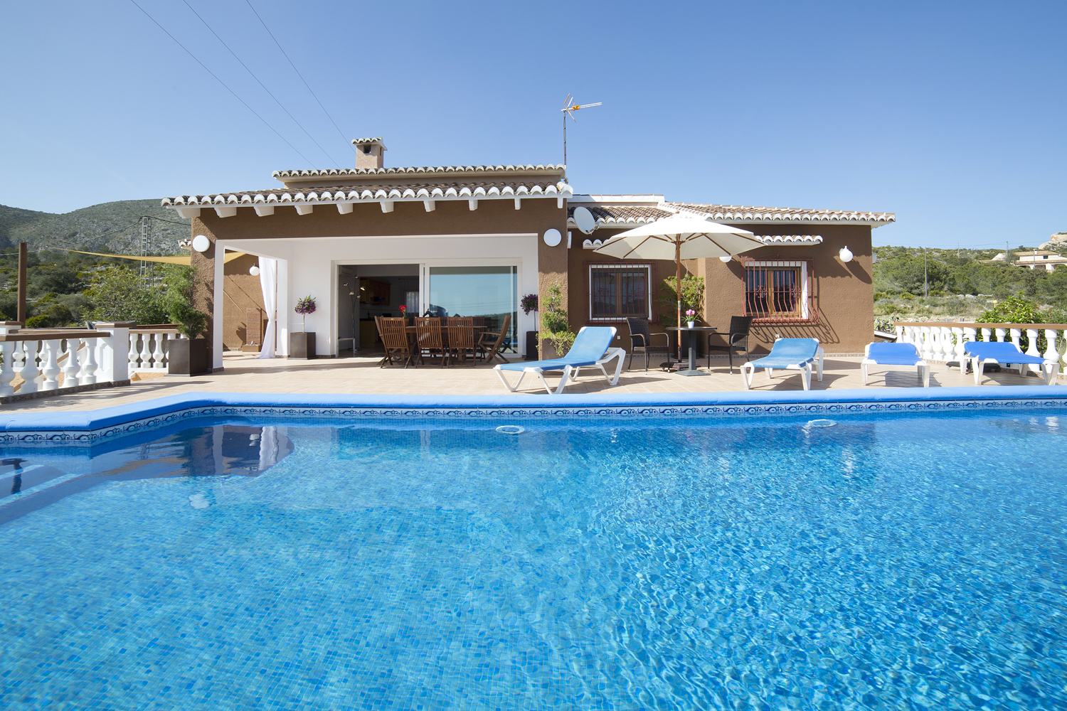 Große neu renovierte Villa von 2018 mit privatem Pool in Teulada/Moraira, an der Costa Blanca, Spanien für 12 Personen. Das Haus ist den ganzen Tag über sonnig und hat nur einen Schritt vom Hauptgeschoss zum Schwimmbad.