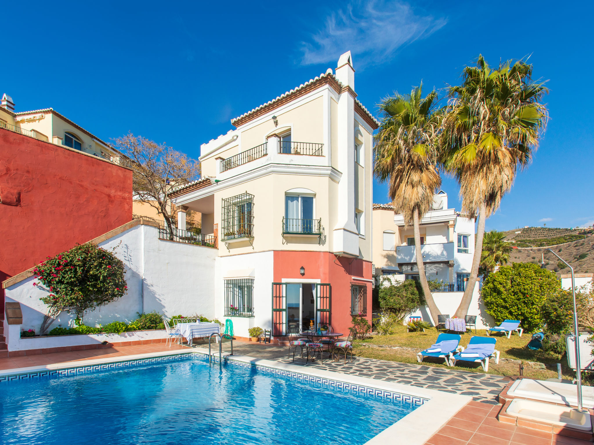 Torrox 1 km von Nerja: Germáumiges Haus in einer ruigen Wohngegend, aber nur 15 Gehminuten vom Strand und einer fantastischen Strandbar entfernt. Nerja ist weniger als 10 Autominuten entfernt. Das Haus besteht aus 3 Stockwerken, wobei das Stockwerk, das sich auf der gleichen Ebene wie der Pool und der Garten befindet, mit seiner kleinen Küche, Bad/Dusche, Wohnzimmer und einem Doppelbett, wie eine separate Wohnung ist. Es gibt keinen Innenzugang zu den anderen Schlafzimmern, insgesamt gibt es 4 Einzelbetten und 2 Doppelbetten sowie zwei Küchen. schönes, komfortables Haus "Vista Bonita". Im Ort, 2 km vom Zentrum von Nerja, sonnige Lage im Villenviertel, 500 m vom Meer, 500 m vom Strand. Zur Alleinbenutzung: Garten, Schwimmbad eckig (5 x 7 m, 100 - 180 cm tief, saisonale Verfügbarkeit: 31.Dez.-01.Jan.). Im Hause: Waschmaschine. Einkaufsgeschäft 2 km, Lebensmittelgeschäft 2 km, Supermarkt 2 km, Einkaufszentrum 25 km, Restaurant 500 m, Bäckerei 4 km, Café 500 m, Fußgängerzone 2 km, Biergarten 500 m, Bushaltestelle 1.5 km, Bahnstation "Malaga" 50 km, Sandstrand 500 m, Tauchzentrum 2 km, Thermalbad 2 km. Sporthafen 26 km, Jacht-Hafen 26 km, Golfplatz (18 Loch) 20 km, Surfschule 20 km, Tennis 2 km, Sportzentrum 2 km. Nahe gelegene Sehenswürdigkeiten: Nerja, Torrox, Frigiliana, La Herradura, Almuñecar, Competa. Bekannte Skigebiete sind gut erreichbar: Sierra Nevada. Wandergebiete: Sierra Almijara, Sierra Tejeda, Las Alpujarras. Bitte beachten: Fahrzeug empfohlen. Babyausstattung (inkl.). Der Besitzer akzeptiert keine Jugendgruppen. Be- und Entladen am Ferienhaus möglich. Ferienwohnung Ref. ES5405.127.1 befindet sich auf dem gleichen Grundstück.Verfügbarkeit