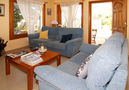 66 m². Wohnraum mit Sitzgruppe, Kamin, Essplatz und Terrassenausgang; durch Theke abgeteilte Küche (4 Flammen, Backofen, Mikrowelle, Kühl-/Gefrierkombination, Kaffeemaschine). Zweibettzimmer. Schlafzimmer mit franz. Bett (1,40 m breit), Gartenausgang. Dusche/WC.
