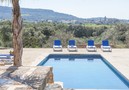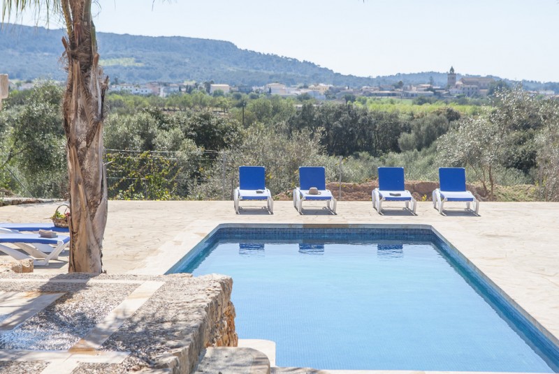 Olivera befindet sich in einer ruhigen ländlichen Umgebung mit Olivenbäumen, Sträuchern sowie einem Garten mit mediterranen Pflanzen und Palmen. Auf der Rückseite des Hauses finden wir den Pool sowie eine überdachte Terrasse mit Esstisch sowie einen Bereich zum Entspannen und Geniessen der friedlichen Umgebung und der schönen Blicke auf die Landschaft und die Kirche von Cas Concos im Hintergrund. Von dieser Terrasse aus führen einige Stufen zum Pool. Hier gibt es eine Rasenfläche, eine Aussendusche und den schön gestalteten Pool ( 4 m x 12 m) der über gemauerte Stufen verfügt. Der Pool wird von einer Sonnenterrasse mit Liegestühlen umgeben und ist der ideale Platz, um die langen und warmen Sommertage zu geniessen.